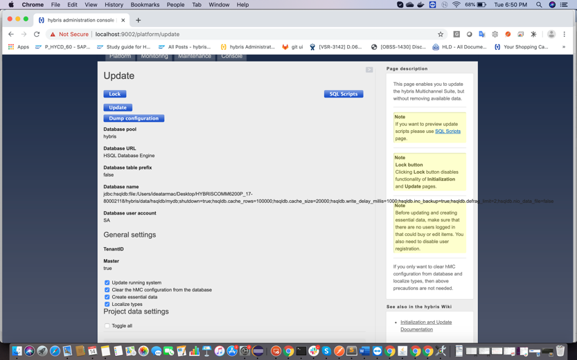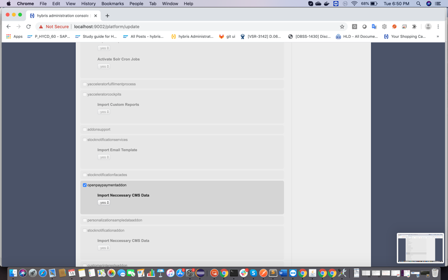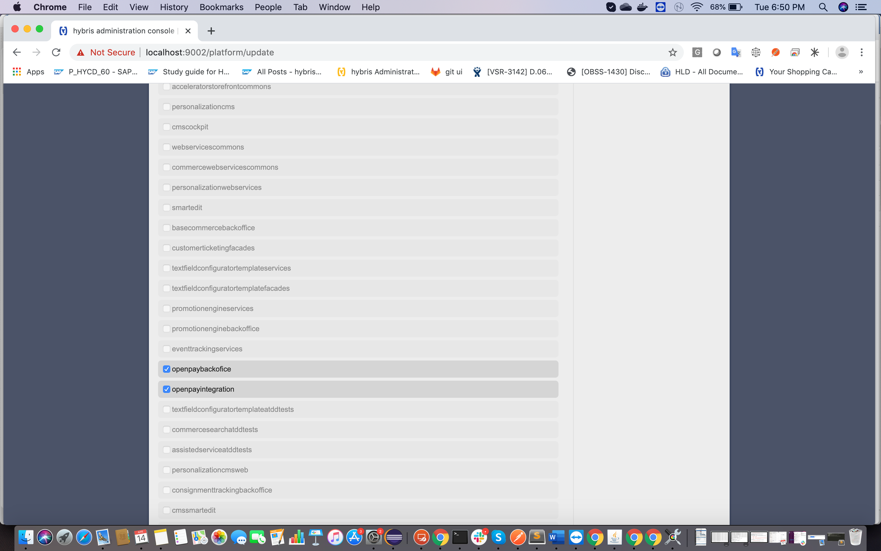 Go to Browser and type URL {https://localhost:9002/} login with credentials admin/nimda. Go under Platform tab > Update, select openpayintegration,openpaybackoffice amd openpaypaymentaddon and run update
