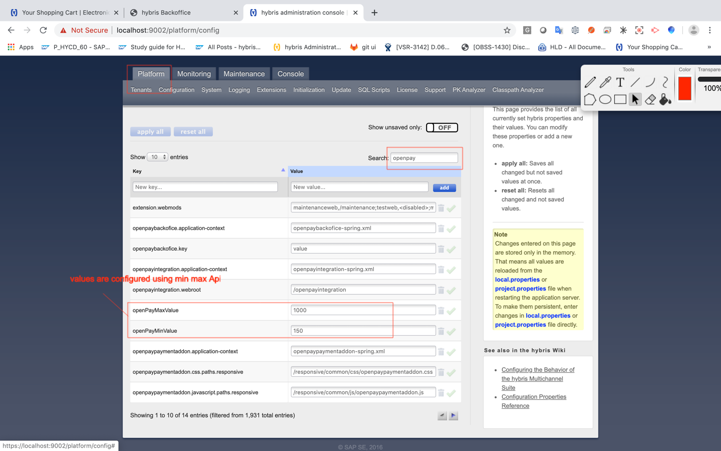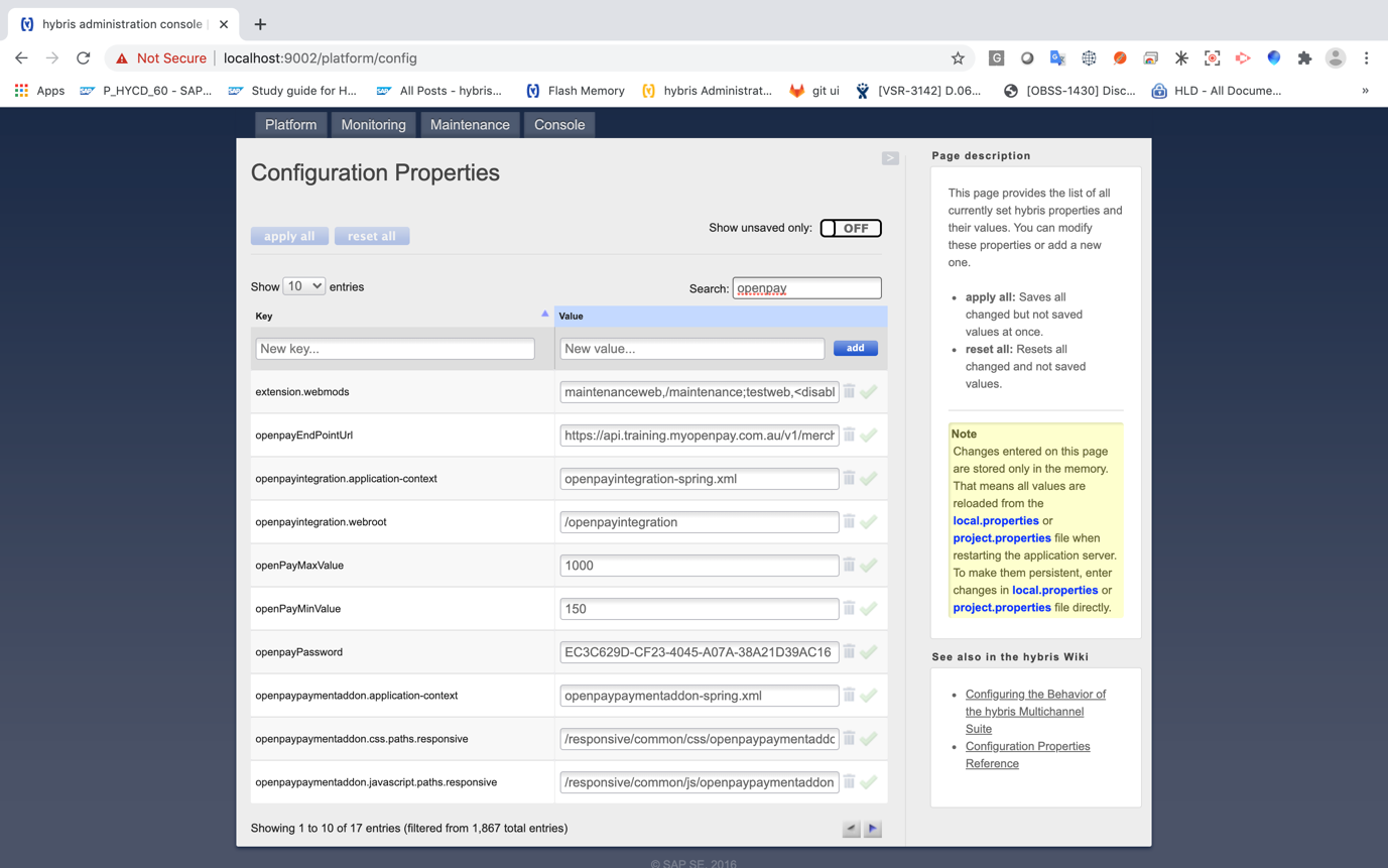 Once limits are configured they can be checked in Hybris Administration control. Go to https://localhost:9002 > login using password (nimda)> Go to Platform tab > select configuration tab > search with keyword ‘Openpay’
