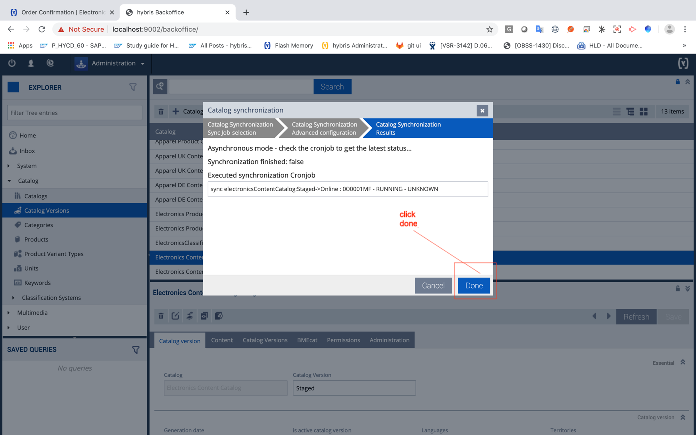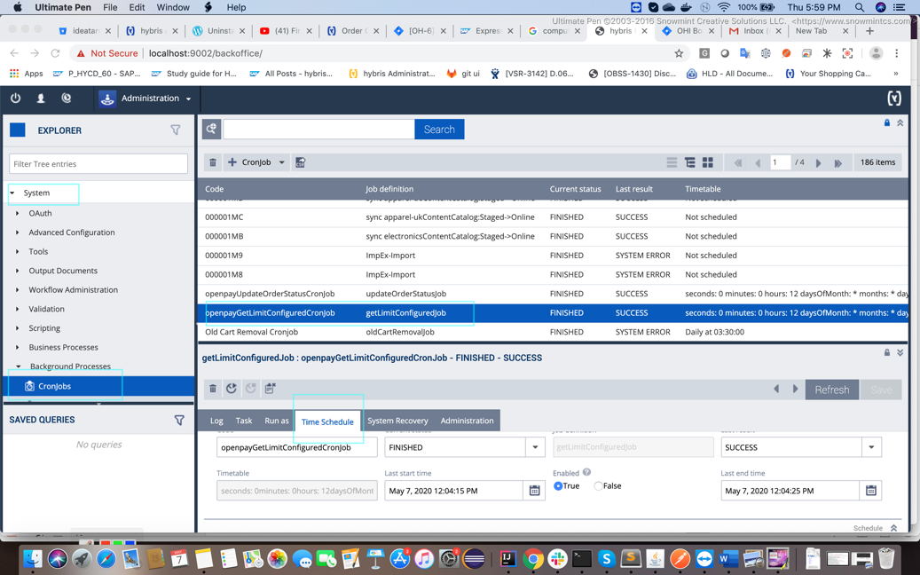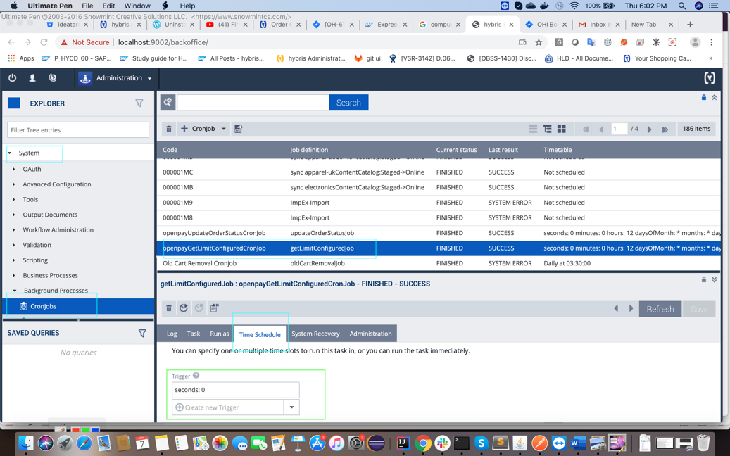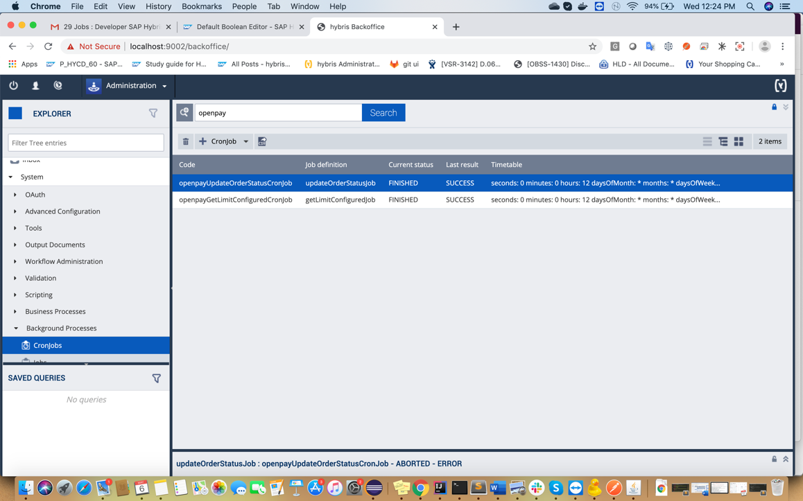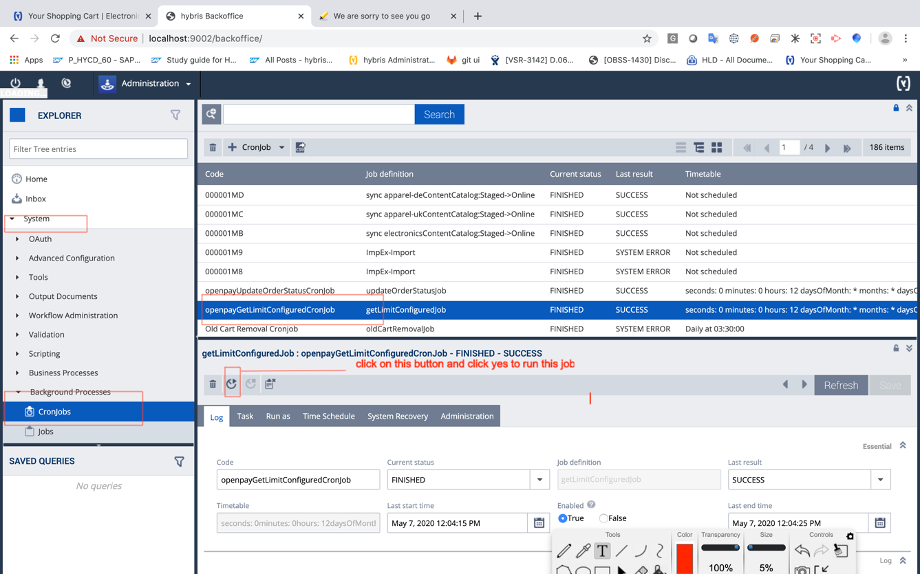 Once completed open backoffice by URL https://localhosthost:9002/backoffice. Check whether cron jobs are added or not by going to System >Background Processes > Cronjobs Automatic cronjob for limits is configured which has to be run once manually during installation