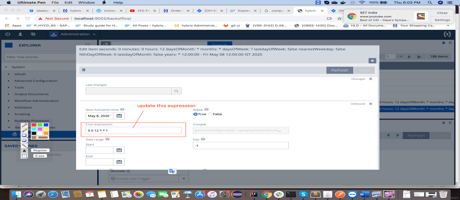 Open particular cronjob to update the scheduled trigger by Go to Backoffice (https://localhost:9002/backoffice) —> Login with credentials (admin/nimda) > System tab > BackgroundProcess > CronJobs > Select one cron job to be updated like openpayUpdateOrderStatusCronJob. Go to highlighted tab Time Schedule