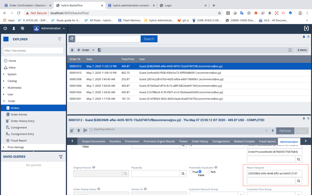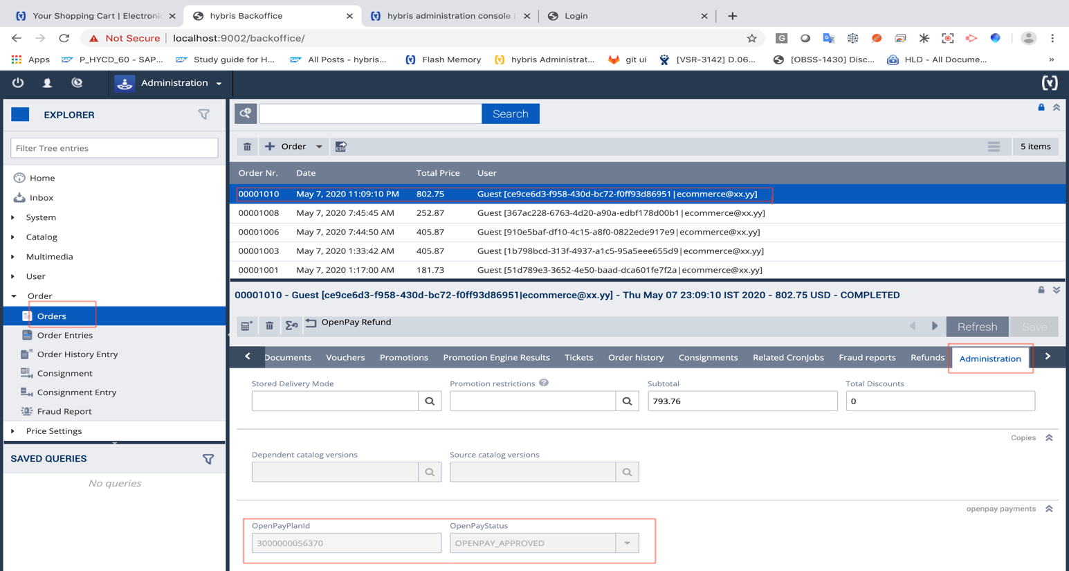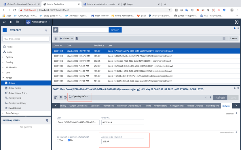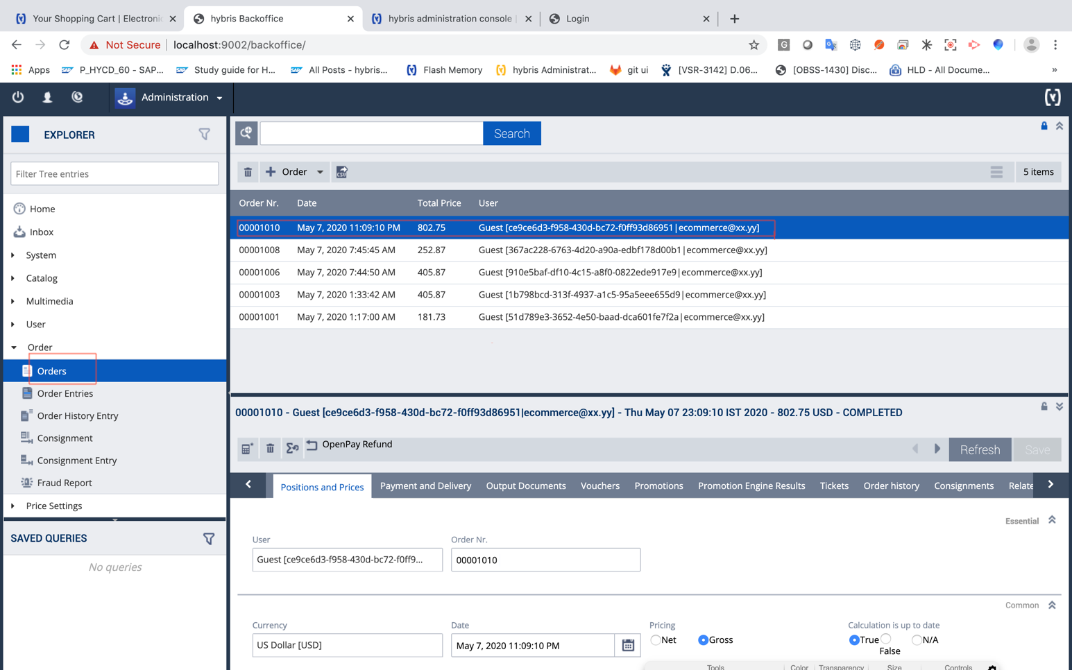 Login to backoffice (https://localhost:9002/backoffice). Login with credentials (username: admin / password: nimda) and go to Order tab.