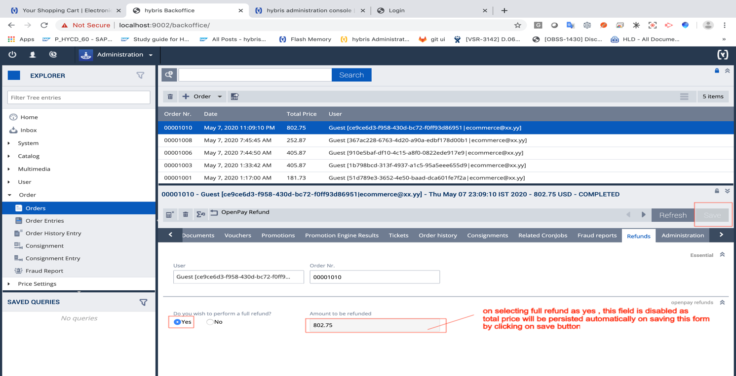 Before clicking on refund button add details on refund tab like whether its full or partial refund, amount to be refunded. If its full refund just select ‘Yes’ and save the form, value will be persisted automatically. For partial refund select ‘No’ and add amount to be refunded.