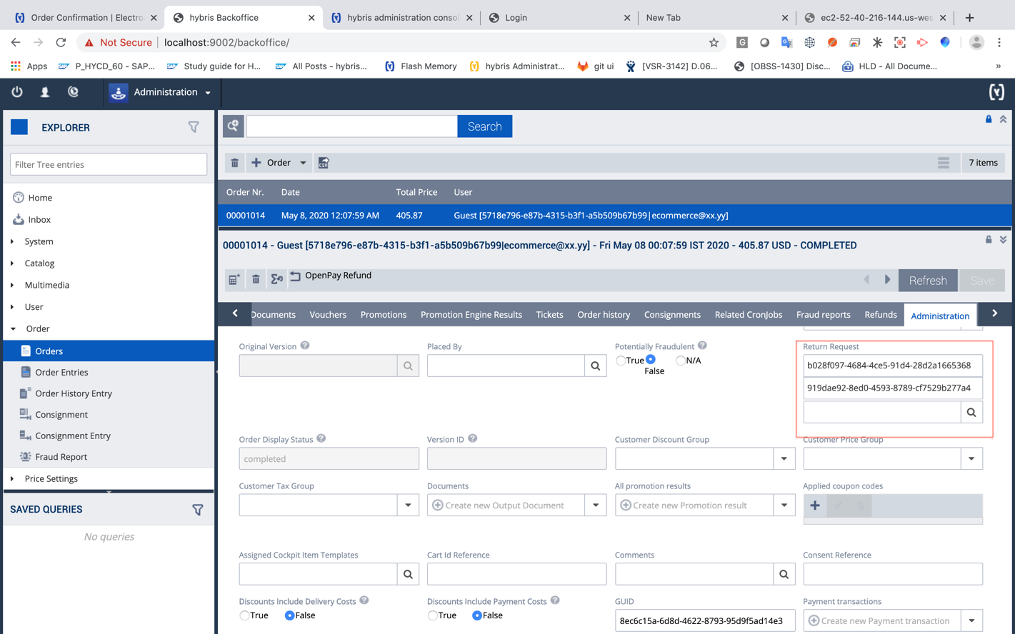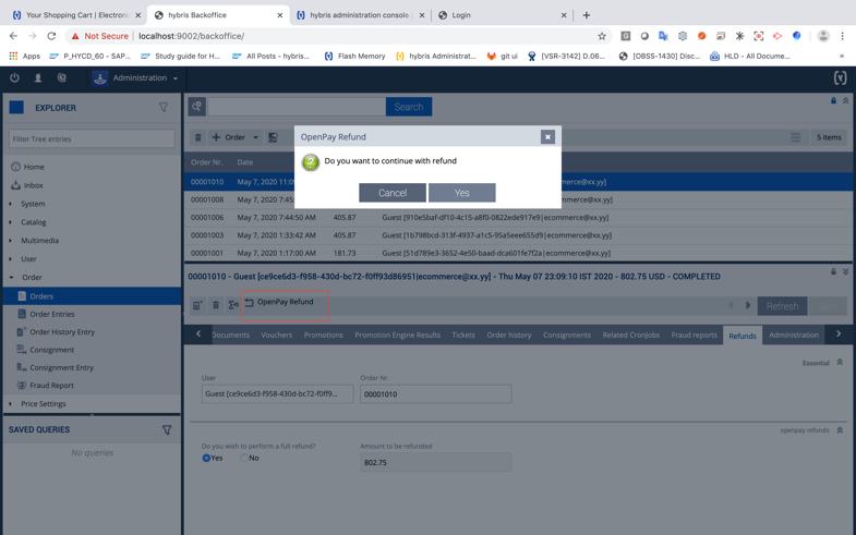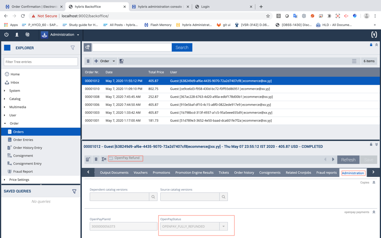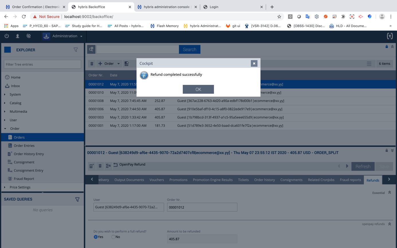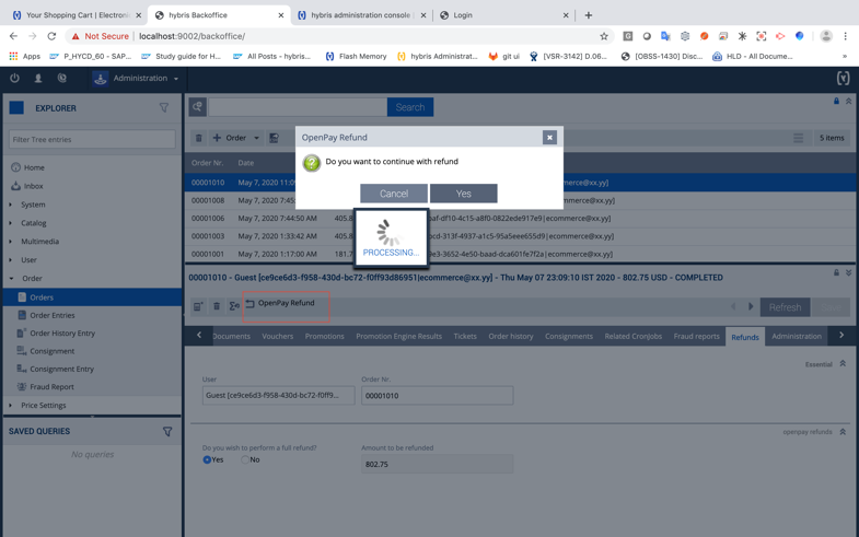 Once order is placed successfully in Hybris we can check order in backoffice and we can perform refunds if possible. Just in above screenshots check we created order with order id “00001010”, check order confirmation page. We check the order with same id on backoffice.