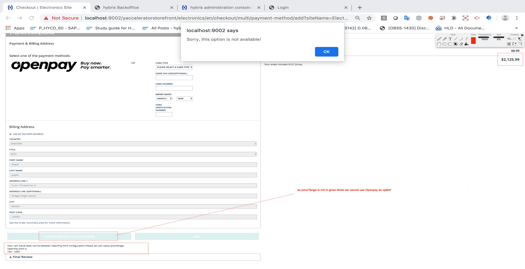If cart price is not in range of configured values we cannot move further with payment option as Openpay.