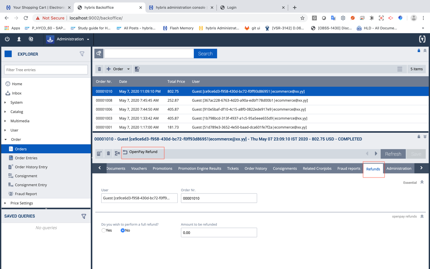 For refunds, order should be shipped or pickup complete (consignment should be created) and Openpay order status should be OPENPAY_APPROVED to activate refunds. Refund button is available on editor area of tab as shown in screenshot above.