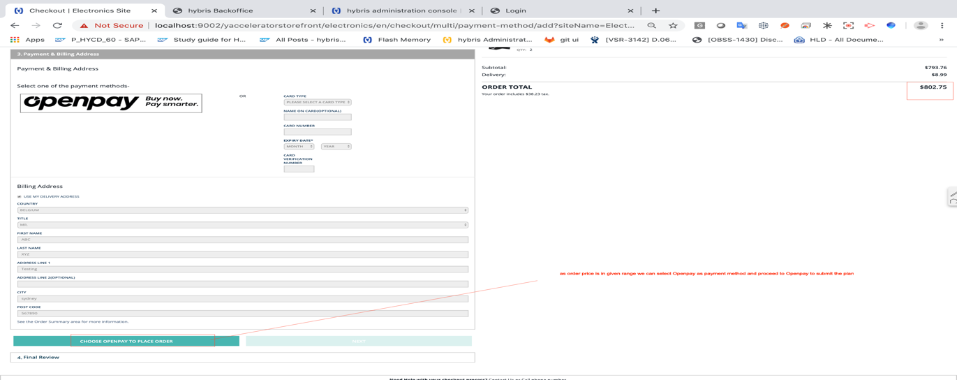 After successfully adding shipping details we move to payment section where along with OOTB payment method Openpay payment method is added. This method is selected only if order price is between given range configured.