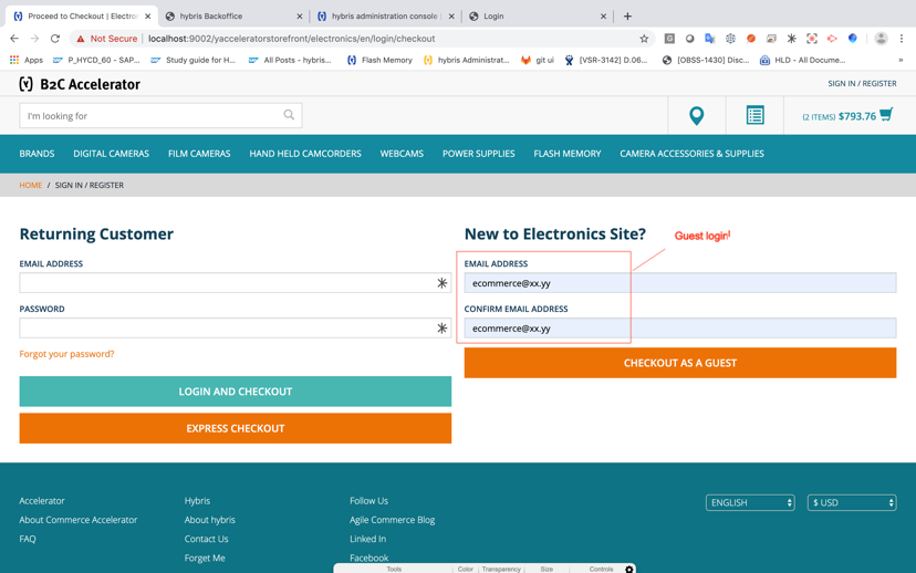 If its new installation for Hybris 6.2 register does not work OOTB due to some recaptcha private and public key, so please just disable the captcha from backoffice and then registration works. We can checkout as guest as well. This is just in case registration is required.