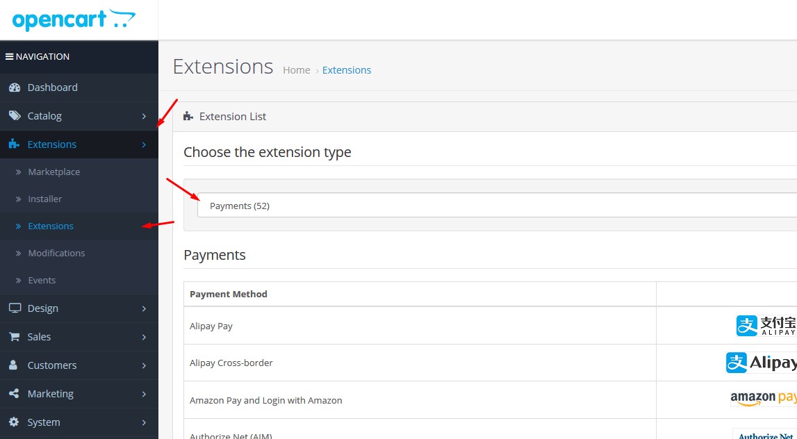 Extensions > Extensions > Choose the extension type > Select ‘Payment’ from the dropdown > Openpay > Install