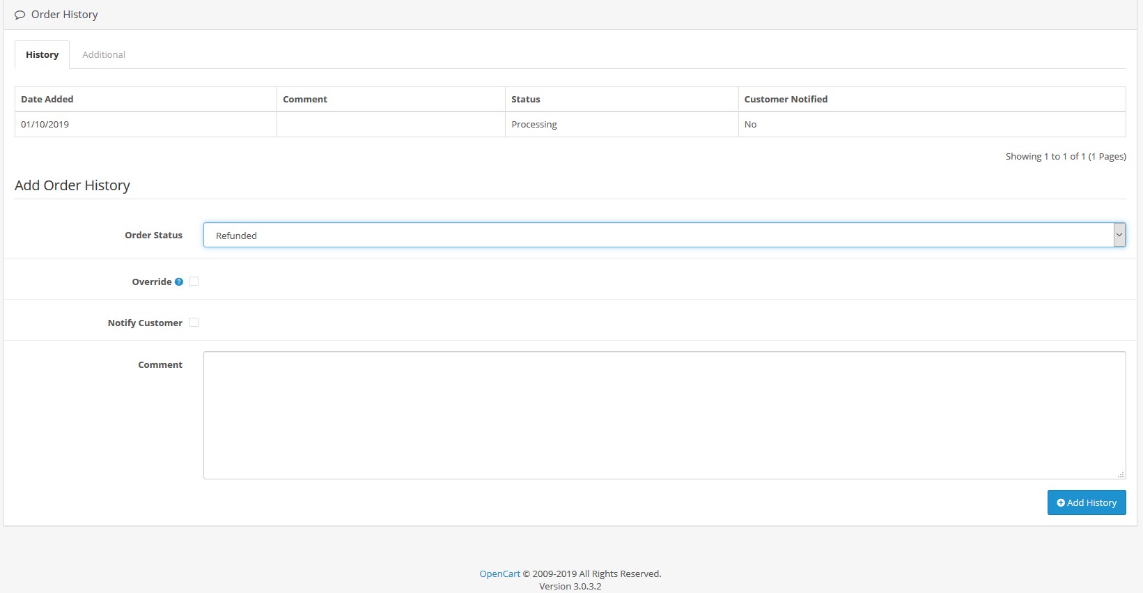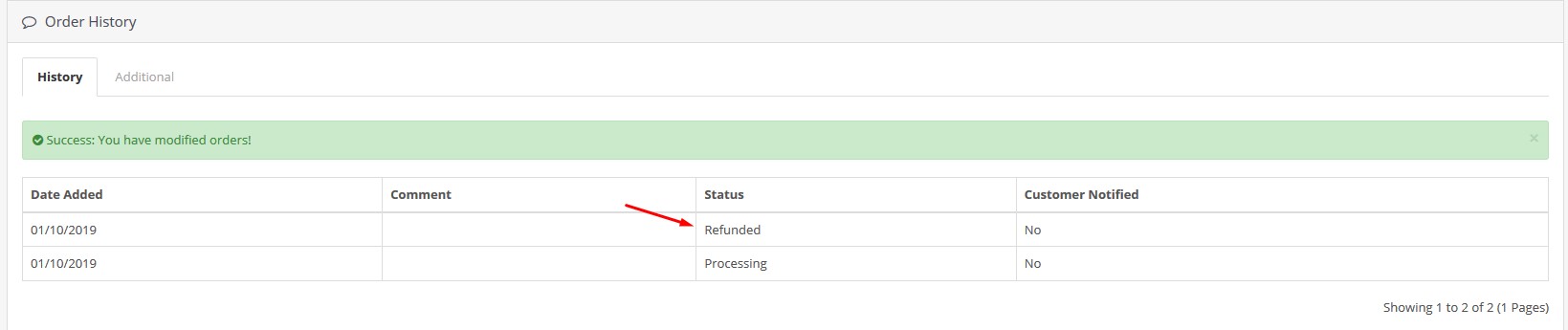 Under ‘Add Order History’ > Order Status > select ‘Refunded’ on the dropdown menu and click ‘Add history’ button.