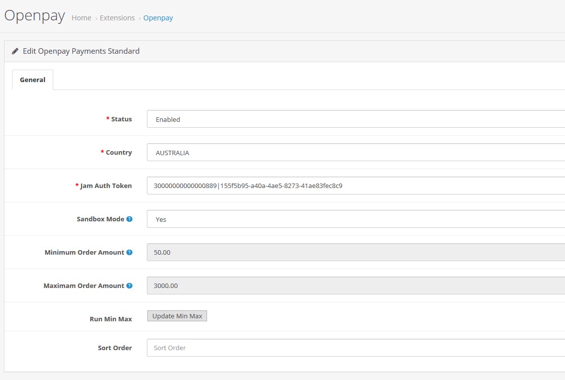 (Order amount should be greater than minimum and less than maximum to enable Openpay payment method on the frontend of your site. This value is displayed on the on Jam Token provided.)