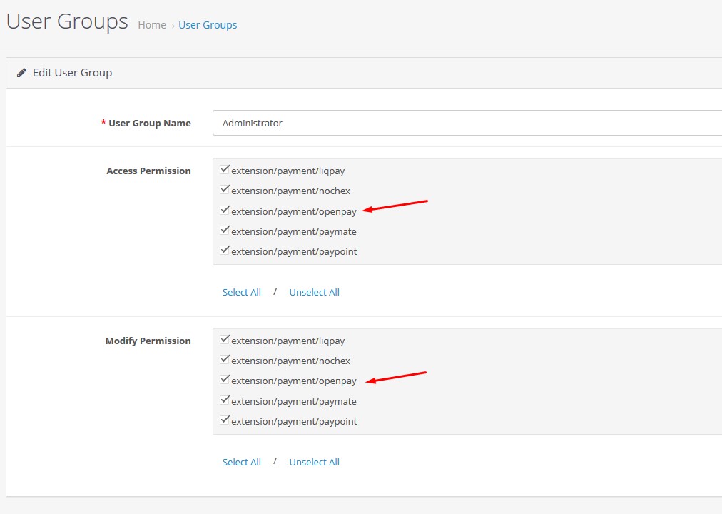 Navigate to System > Users > User Groups > Edit ‘Administrator’ > Select installed module ‘extension/payment/Openpay’ in Access Permission and Modify Permission Section > Save