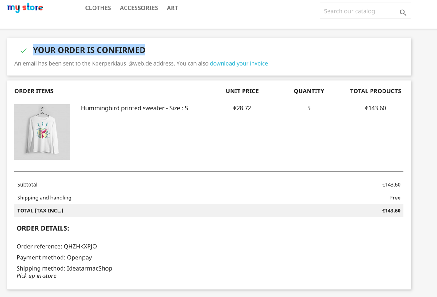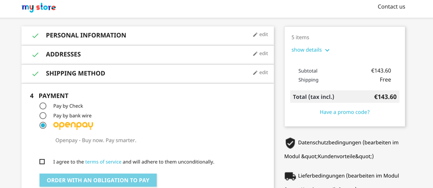 Openpay method would show on the checkout page if the order total falls under the eligible Minimum and Maximum checkout values. After completing the plan in Openpay, the customer is redirected back to the order confirmation screen in Prestashop.