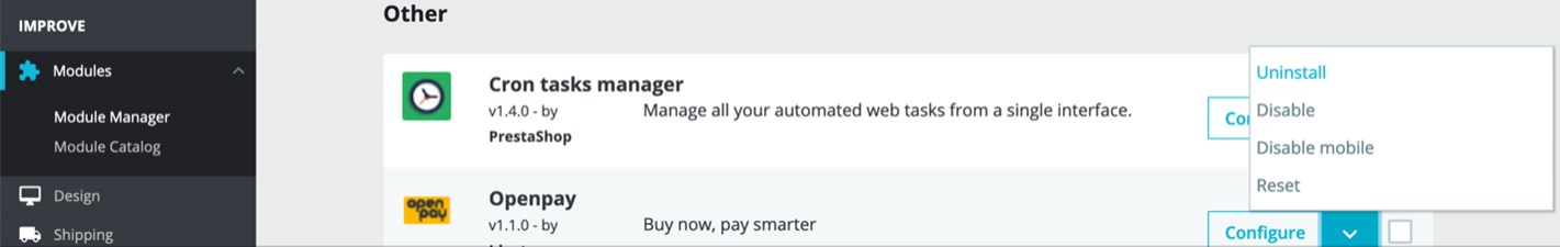 In Menu: Modules – Module Manager all installed Modules are listed. Search ‘Openpay’ and select Configure.