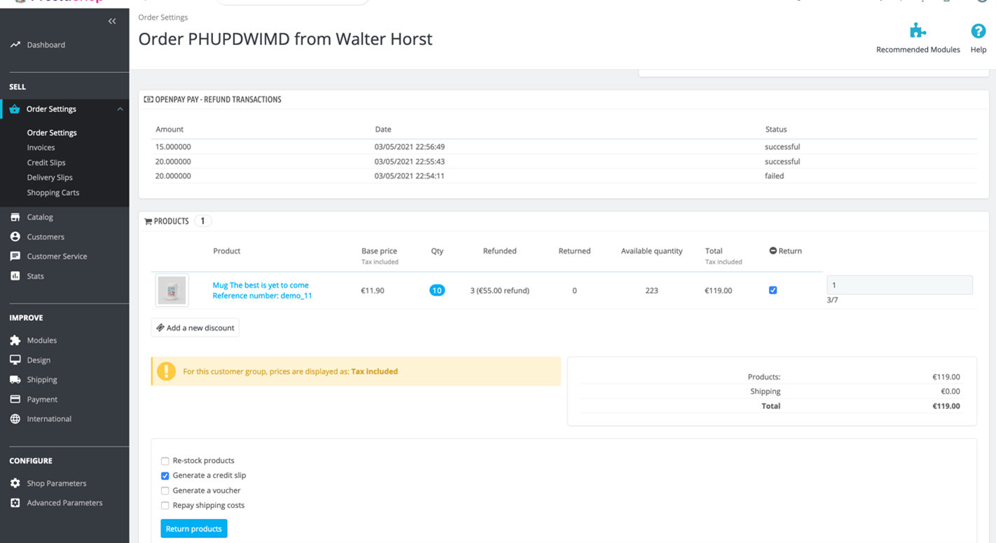 All Orders with status Openpay approved status can be partial and full refunded. If whole amount was refunded then order will be changed to Openpay refunded status.