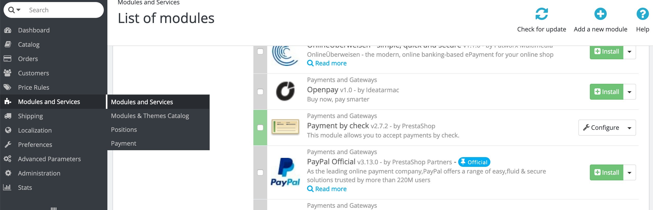 • Then go to prestashop backoffice and navigate into the menu “Modules and Services”.