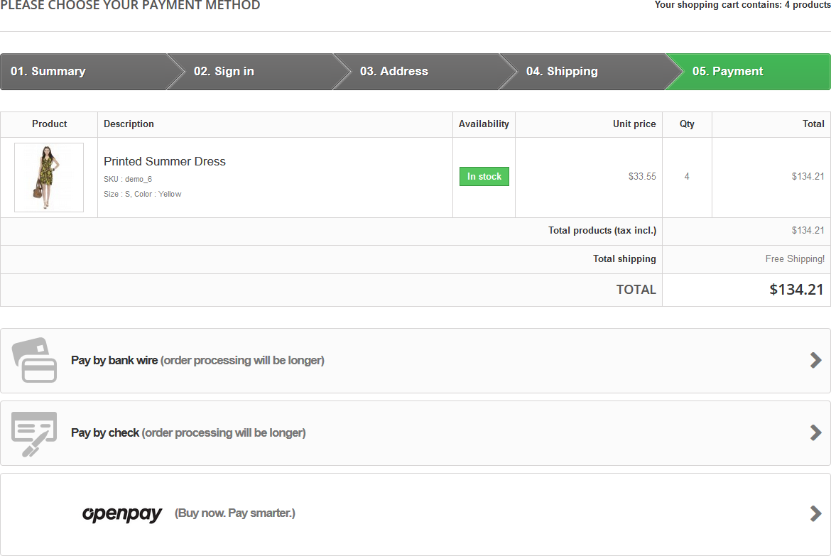 Order products whose sum is higher than Widget Minimum Price (configured in Backoffice). Click on the Button “Openpay”. After clicking Buy now button, customer should be redirected to Openpay Payment Gateway. After execution of all steps, customer will come back to PrestaShop with status canceled or approved.