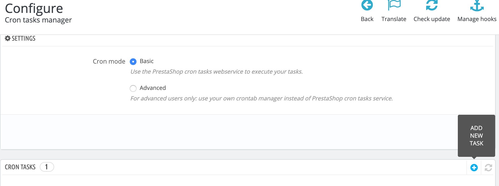 For jobs, we need the administrator module Cron tasks manager. It will be installed by default. After clicking “Configure” button, a new job should be created.