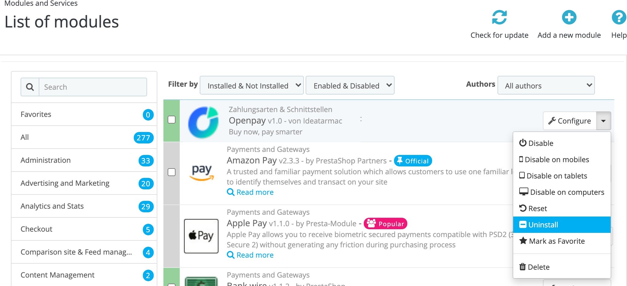 Navigate to Modules and Services > List of modules > Openpay > Configure (dropdown) > Uninstall
