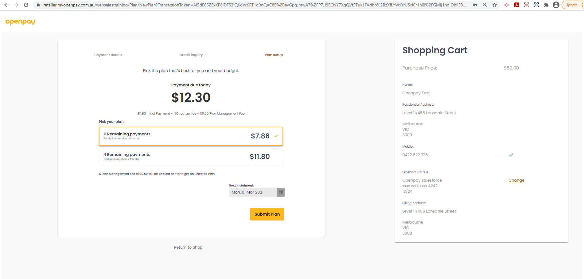 Openpay Handover URL: https://retailer.myopenpay.com.au/websalestraining/?TransactionToken=