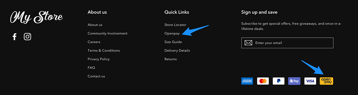 After publishing the landing page, the next step is to add a Quick Link and Trust Seal to the footer linking to the Openpay Landing Page.
