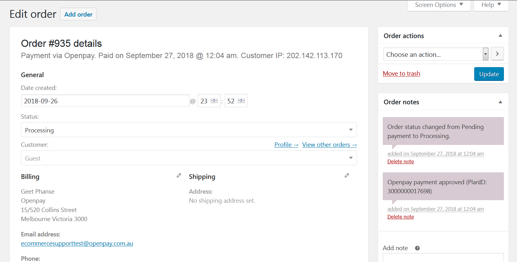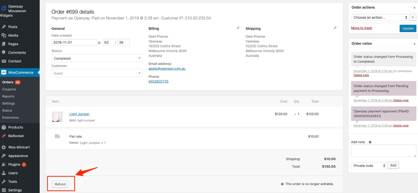 To check Orders, go to: WooCommerce > Orders > (ANY ORDER placed using Openpay)