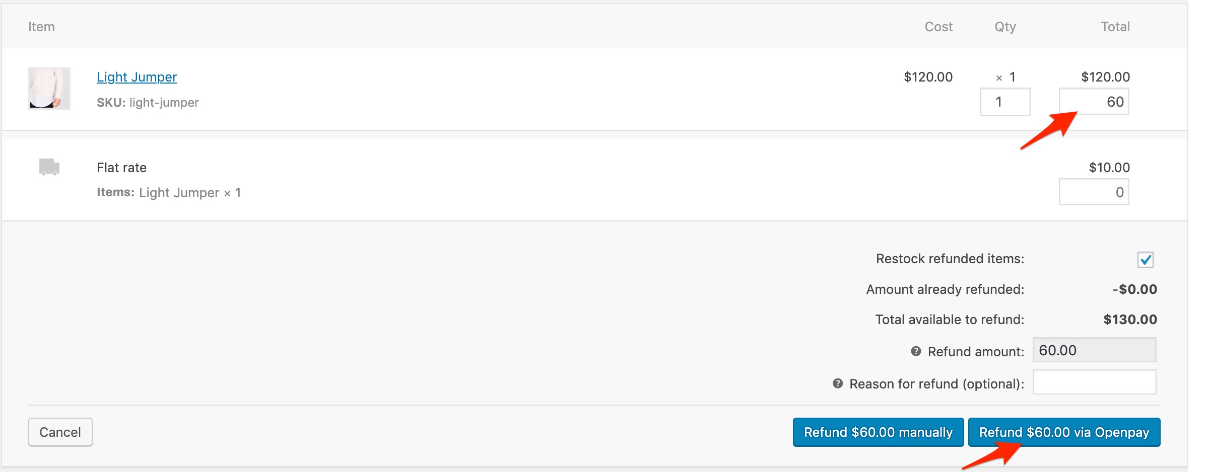 Enter the Partial Refund amount > Click on Refund $XX.XX via Openpay